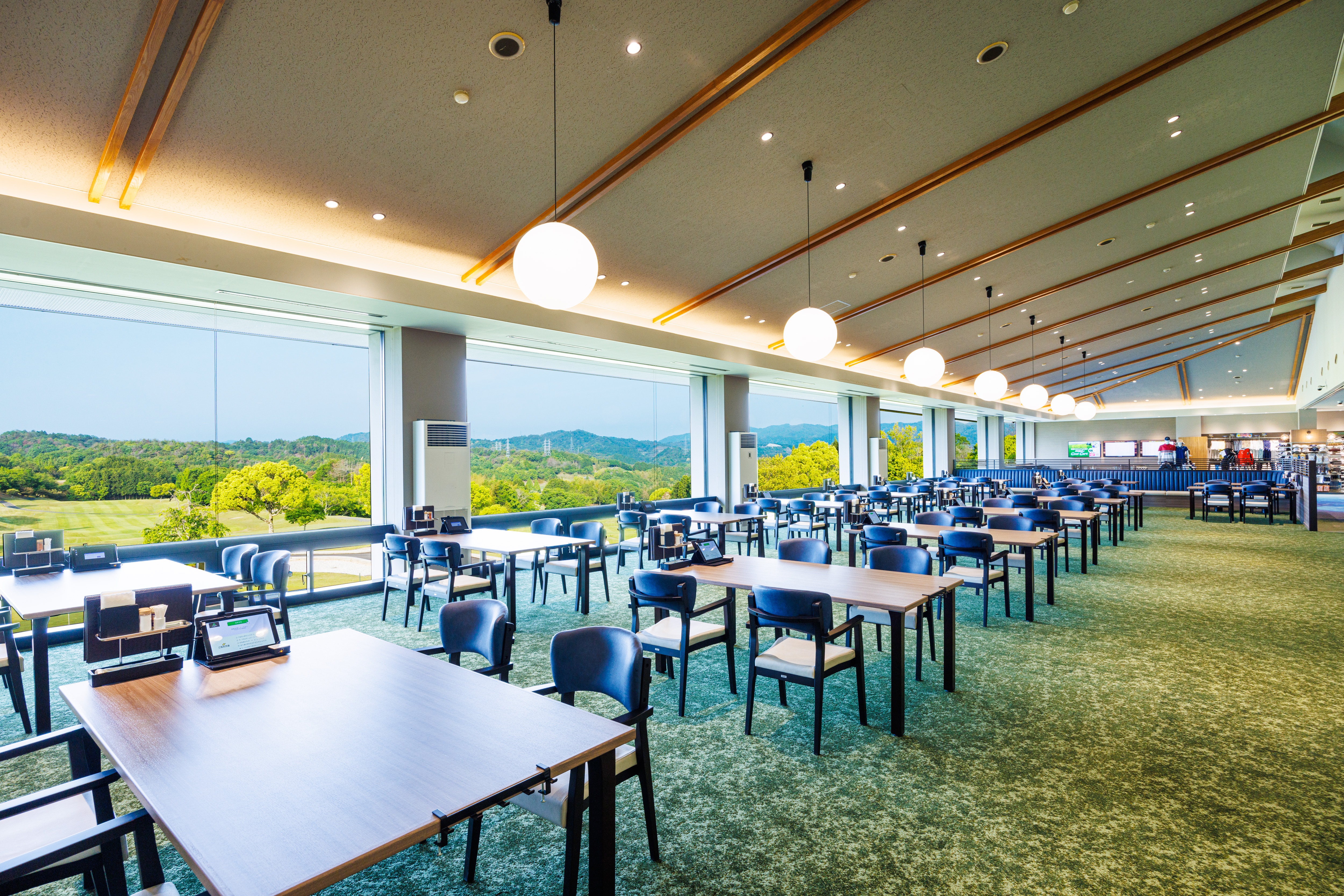左から)クラブハウス外観、幸せを運ぶ蝶が舞うフロント・ロビー、コースの緑と調和したレストラン