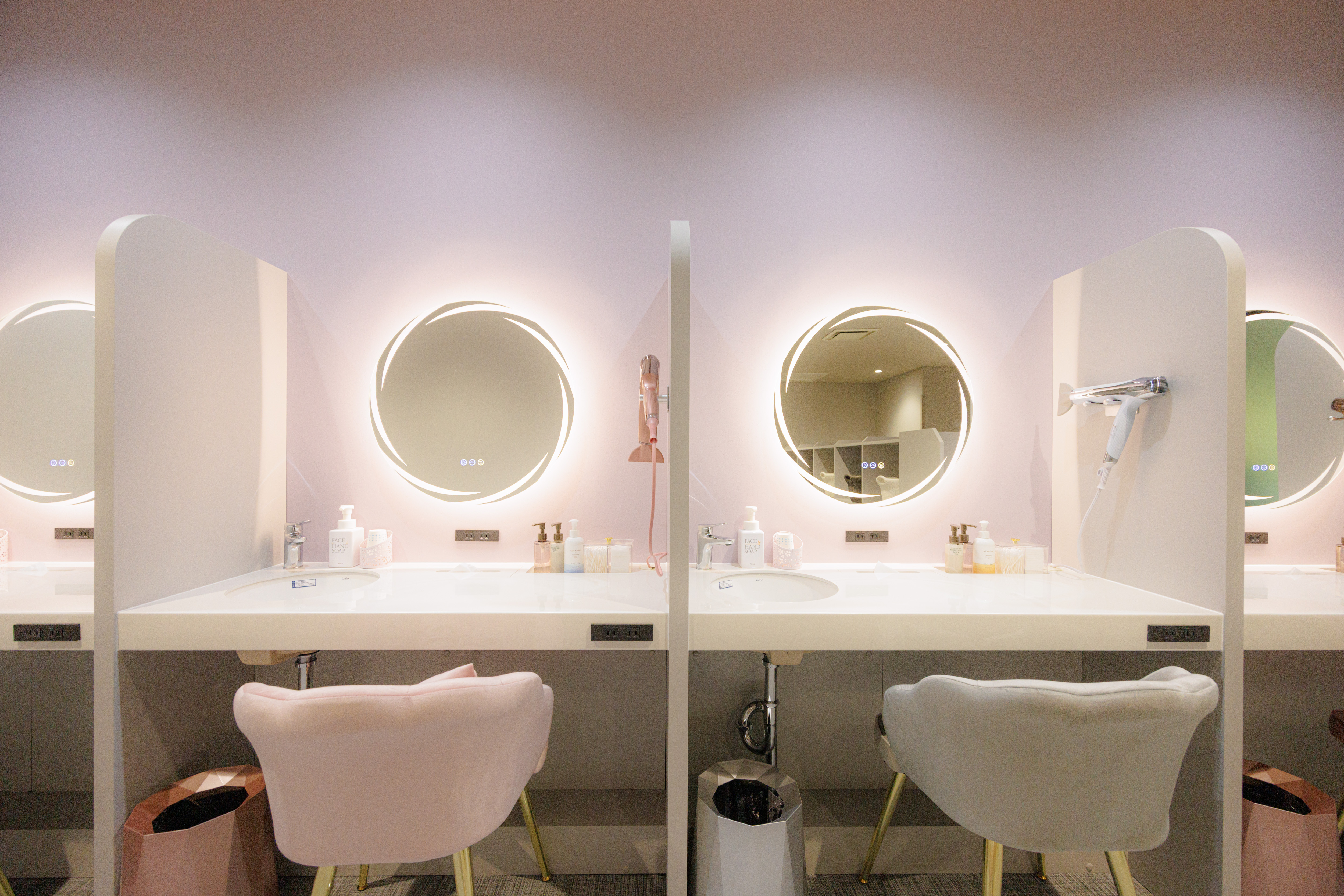 左から)きれいになった女性パウダーコーナー、シャンプーバーを新設した女性浴室、8月に新設した LED ビジョン