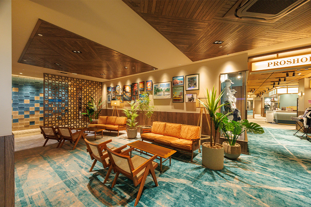 ゴルフスタート前やハーフターンでの待ち時間に最適、リラックスして仲間と楽しく会話ができる南国リゾート感溢れる空間、是非ご利用ください。