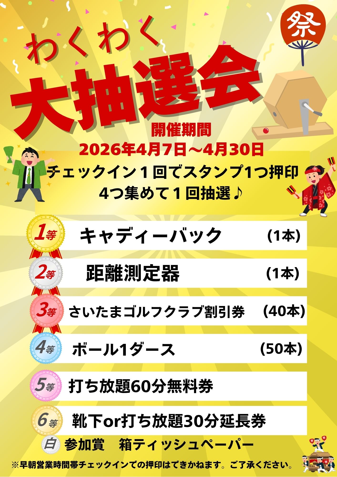 ①練習場フロントにて【2026ガラポンスタンプ参加券】をお受け取り下さい。