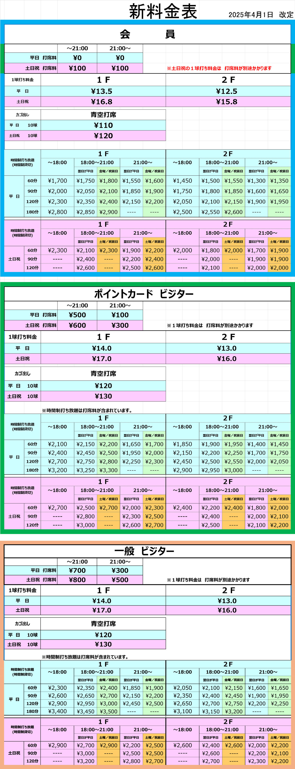 | 打席料 | 500円 | 600円 | |