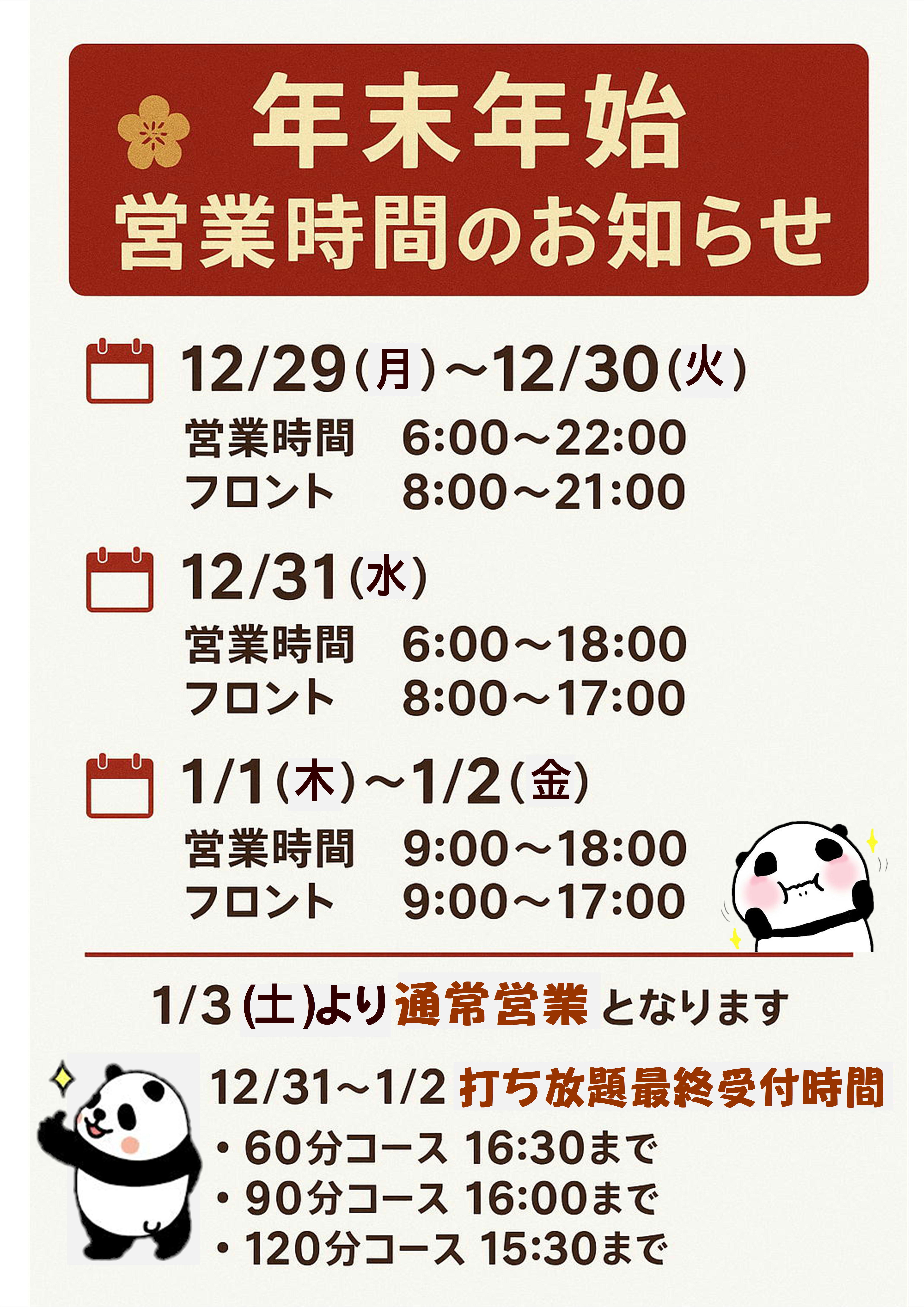 年末年始の営業時間は右記の通りとなります。