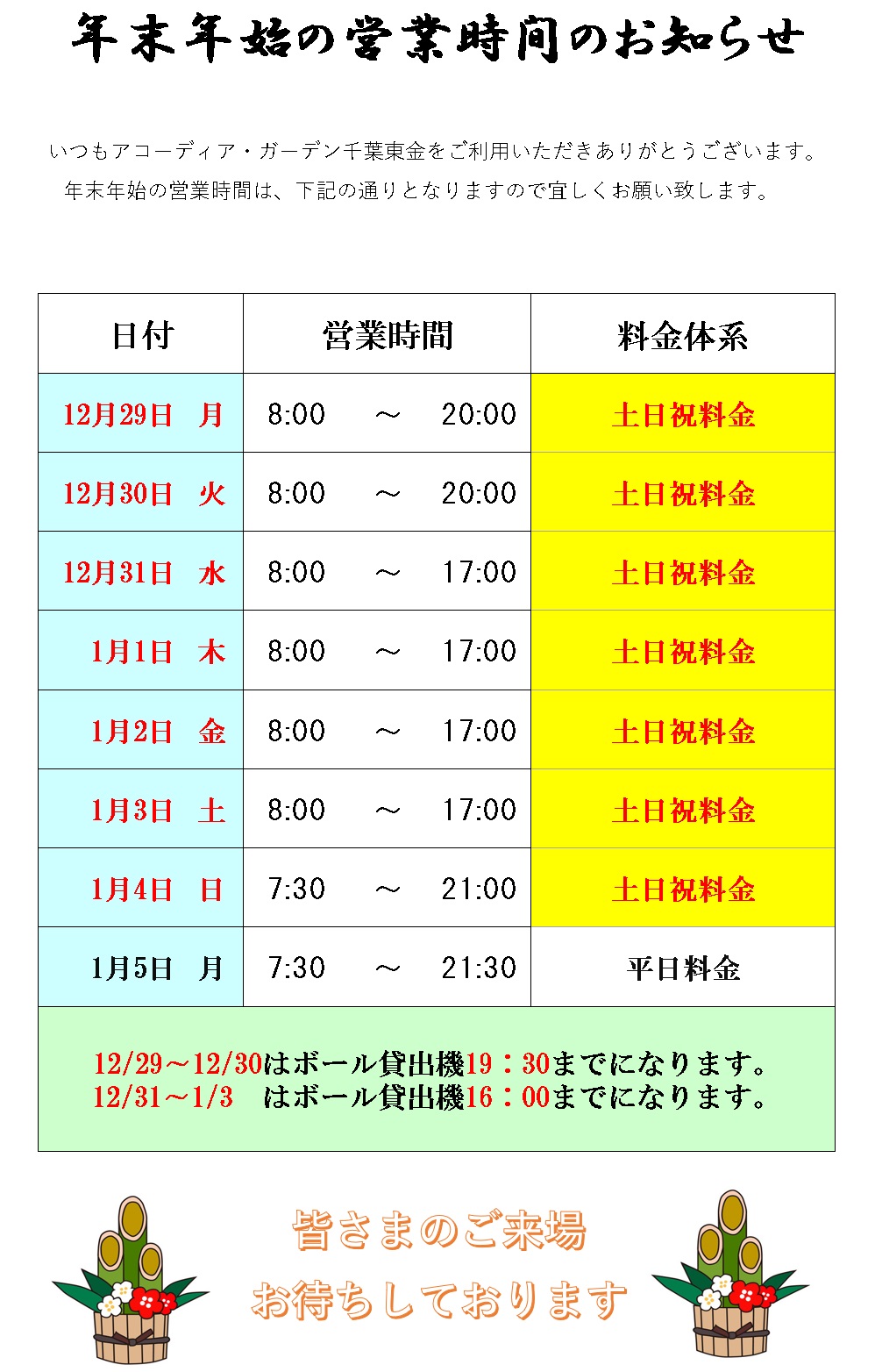 1/1 (木) 8:00~17:00 土日祝日料金 ボール貸出は16:00まで
