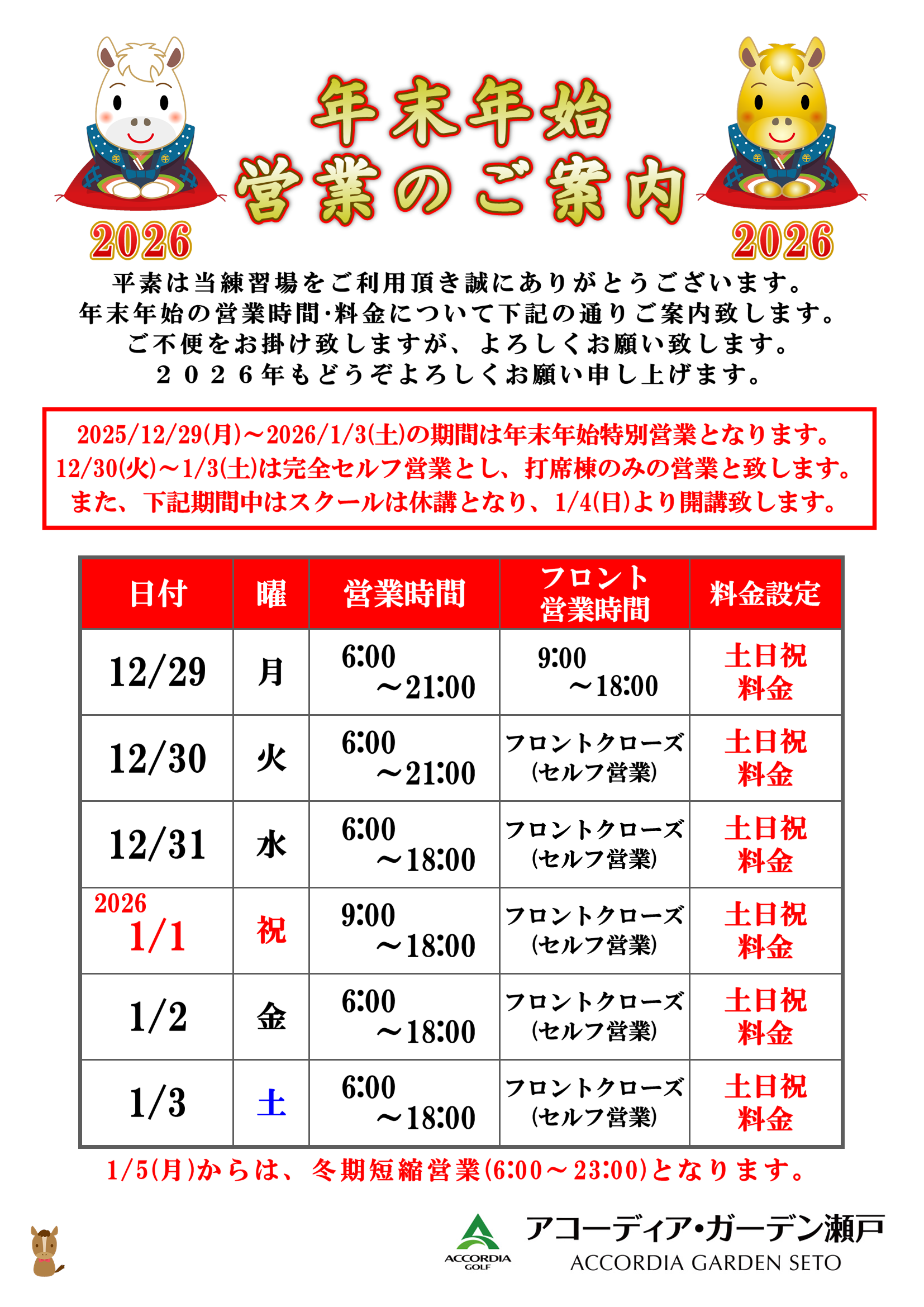12/30(火)~1/3(土)は完全セルフ営業とし、打席棟のみの営業と致します。