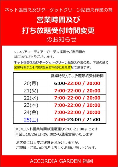 10/20(月)~25(土)までの期間ネット張替え及びターゲットグリーン貼替え作業の為、営業時間及び打ち放題受付時間を変更させていただくことになりました。