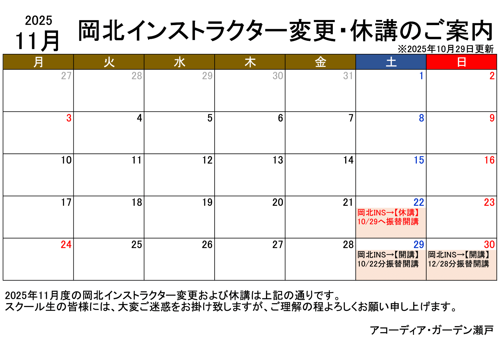 2025年11月の岡北インストラクター変更は下記の通りです