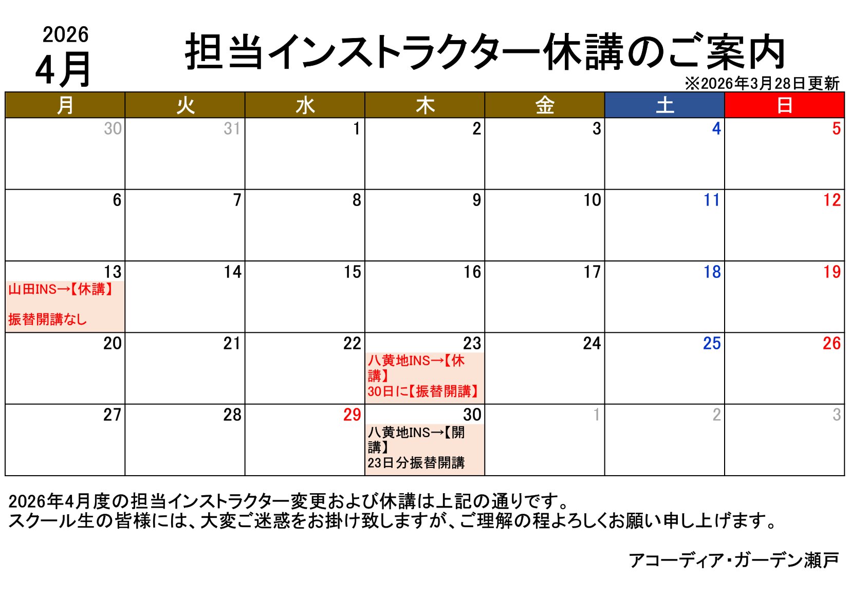 2026年4月の担当インストラクター変更は下記の通りです