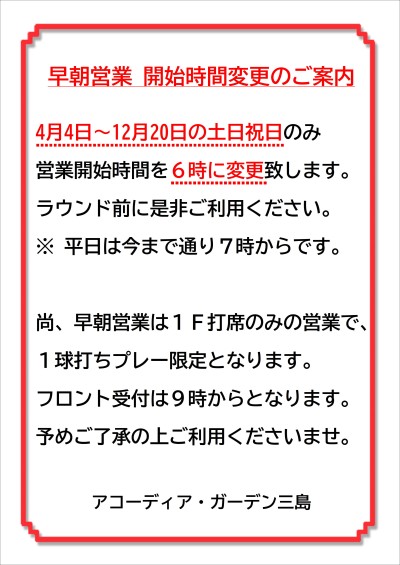 2026年4月4日(土)から2026年12月20日(日)迄の土日祝日の早朝営業を6時開始とさせて頂きます。