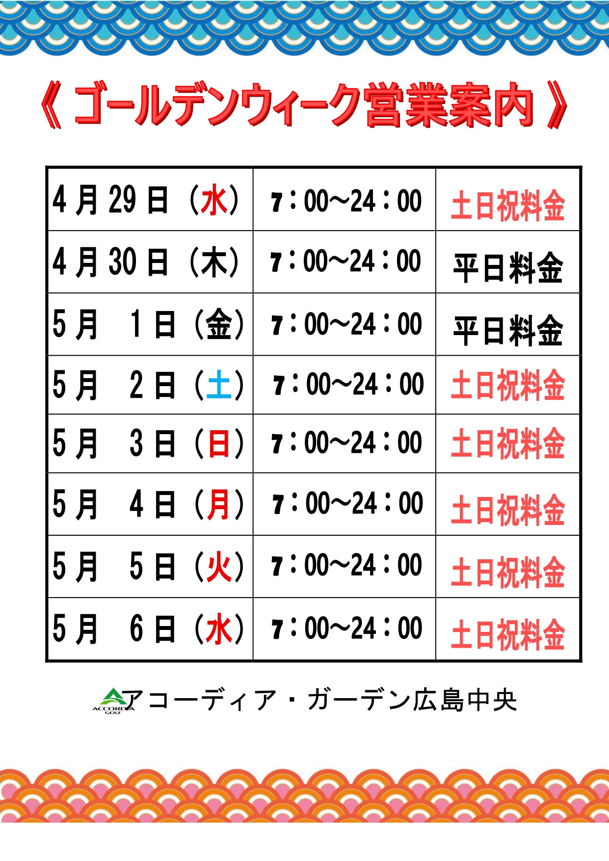 ゴールデンウィーク期間中の営業体制をご案内致します。