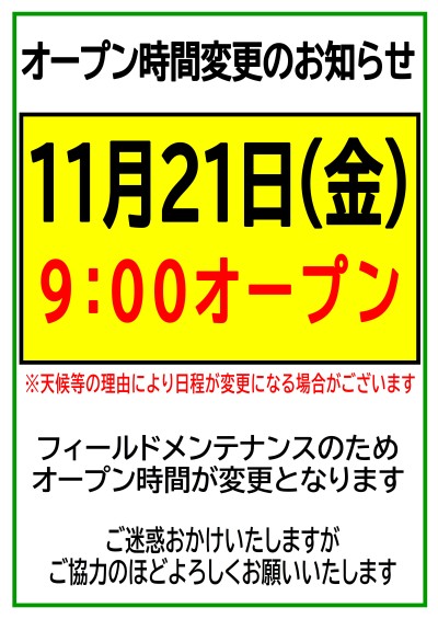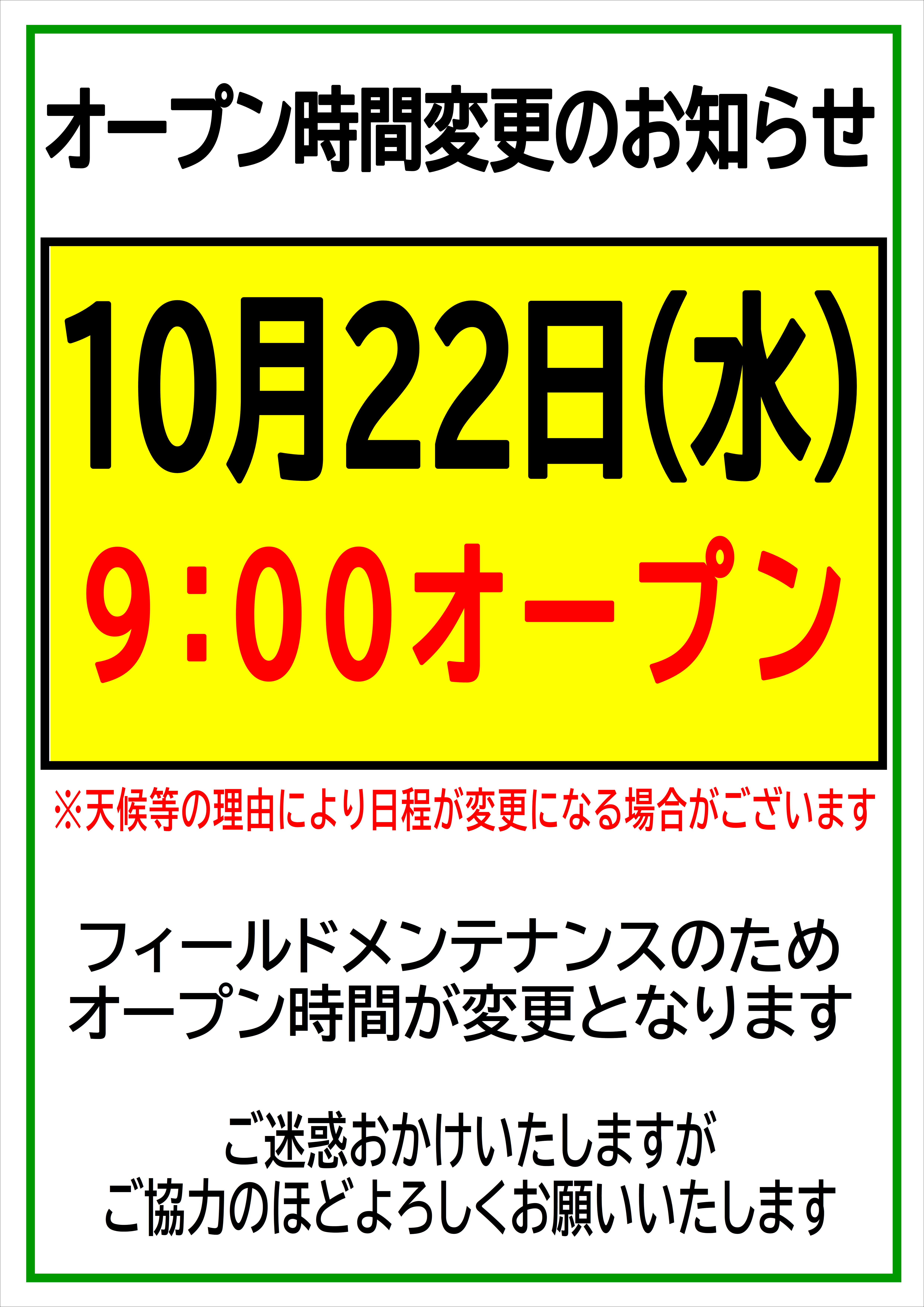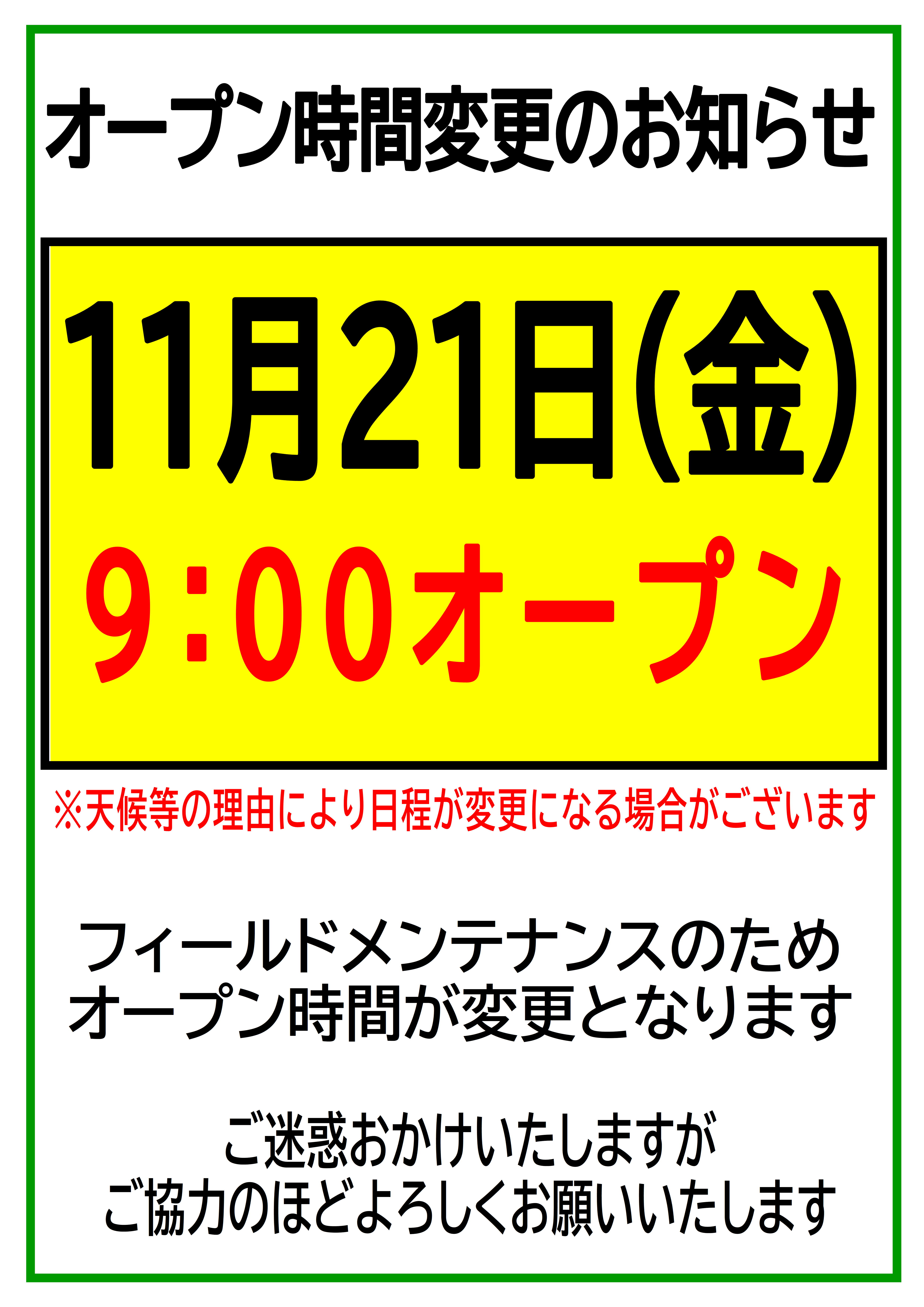 フィールドメンテナンスのため、下記の日程でオープン時間を変更させていただきます。