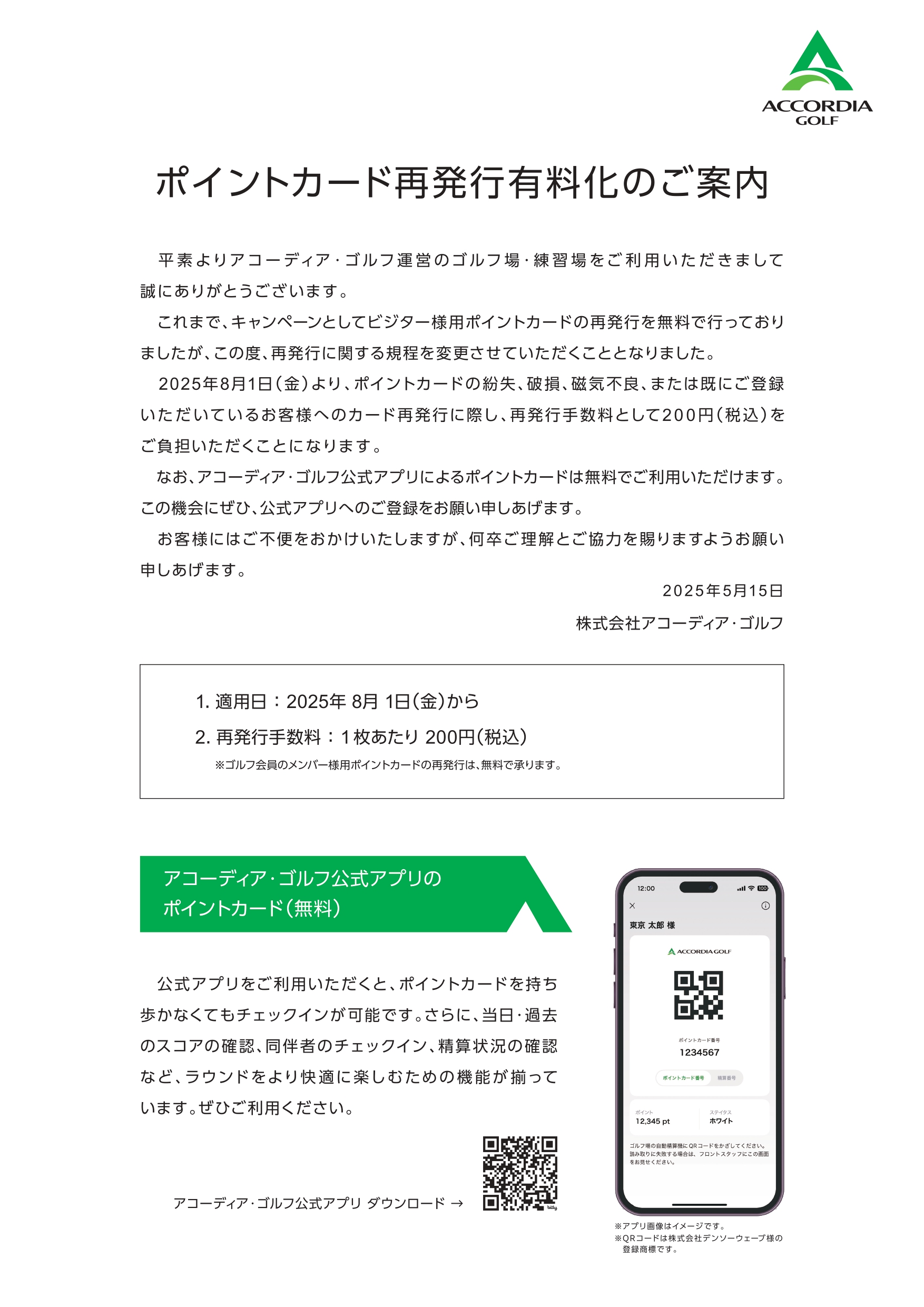 なお、アコーディア・ゴルフ公式アプリによるポイントカードは