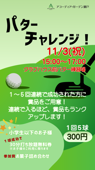 11/3(祝)15:00~17:00 クラブハウス前パター練習場