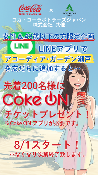 新規にLINE友だち登録をして頂いた女性&49歳以下のお客様限定でCokeONチケットをプレゼント致します。