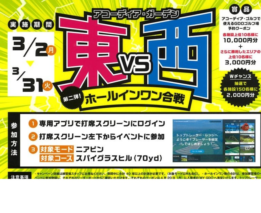 期間中対象モードにてホールインワンを達成された方の中から抽選にて、アコーディア・ゴルフで使えるGDOゴルフ場予約クーポン当練習場上位10名様に10,000円分のクーポン+さらに勝利したエリア(東エリア)の上位者にさらに3,000円分もプレゼントいたします!さらにさらにWチャンスとして各練習場150名様に2,000円分もプレゼント!最大15,000円分のクーポンが当たる大チャンス!