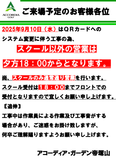 システム変更に伴う工事の為、2025年9月10日(水)は18時からの営業となります。