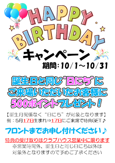 誕生日と同じ“日にち”にご来場いただいたお客様に500ポイントプレゼント!
