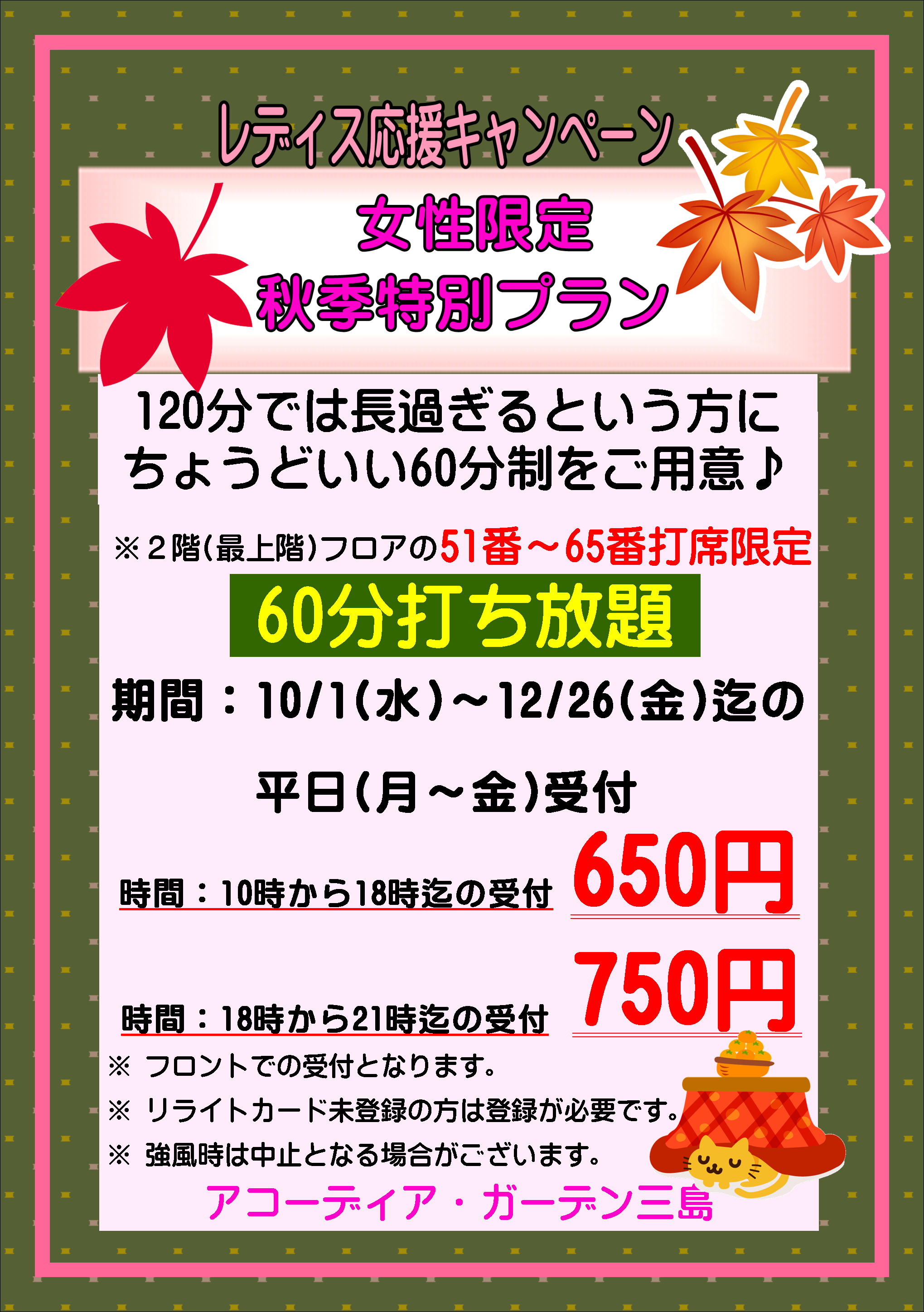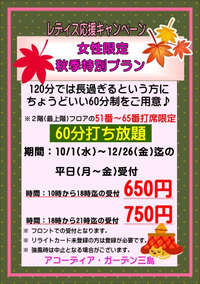 時 間 : 秋冬は10時から18時迄の受付で60分打ち放題650円