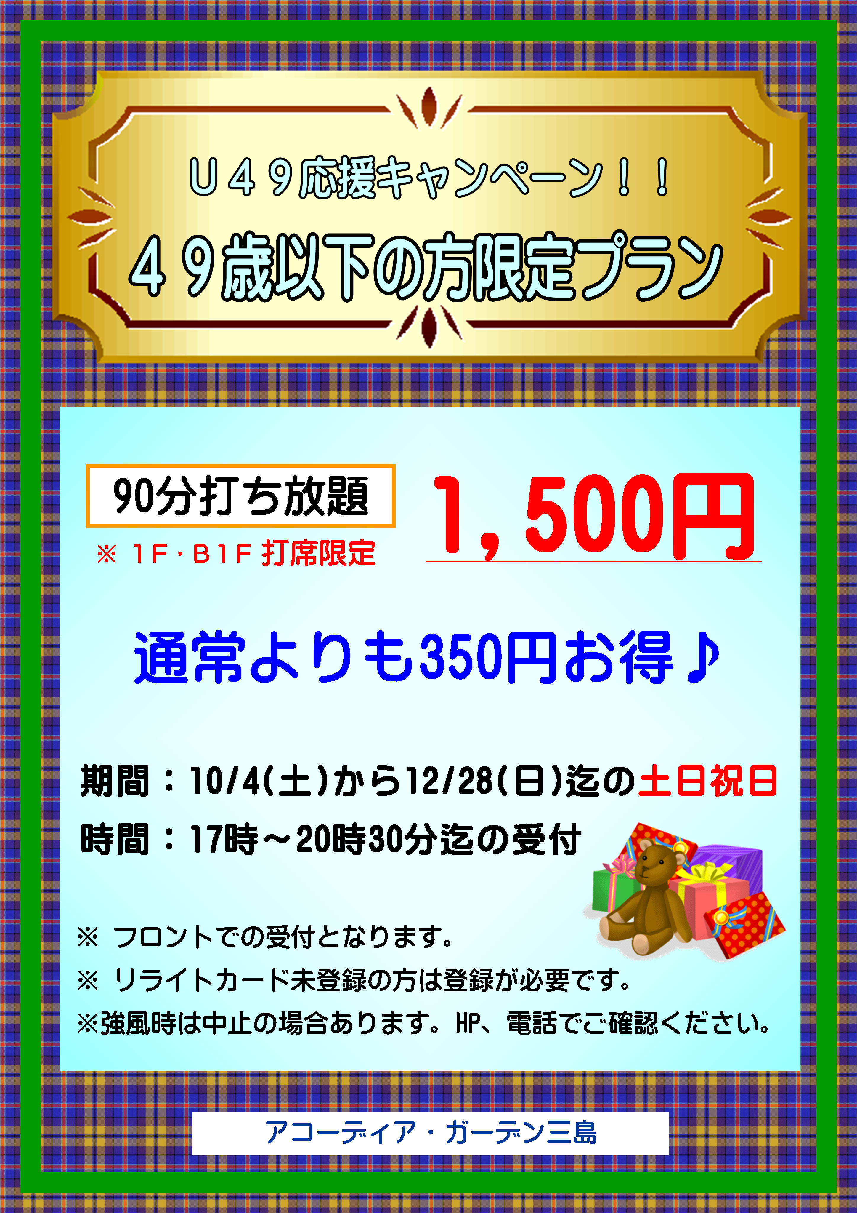 プラン : 1F、B1F打席限定 90分打ち放題1,500円