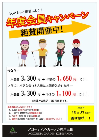 通常入会金3,300円が期間中は1,650円に、またペア入会(2名様以上同時入会)なら1,100円になります。