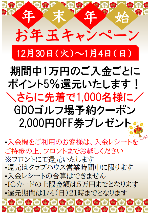 ・入金機をご利用のお客様は、入金レシートをご持参の上、フロントまでお越しください。※フロントにて還元いたします。
