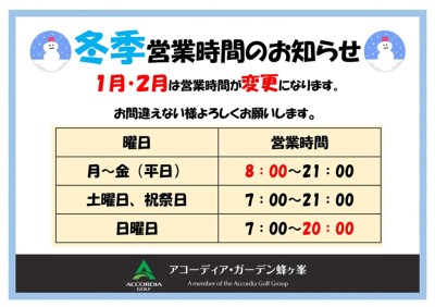 1月・2月は冬季営業のため、営業時間が変更となります。お間違いのないようにお願い致します。皆様のご来場お待ち申し上げております。