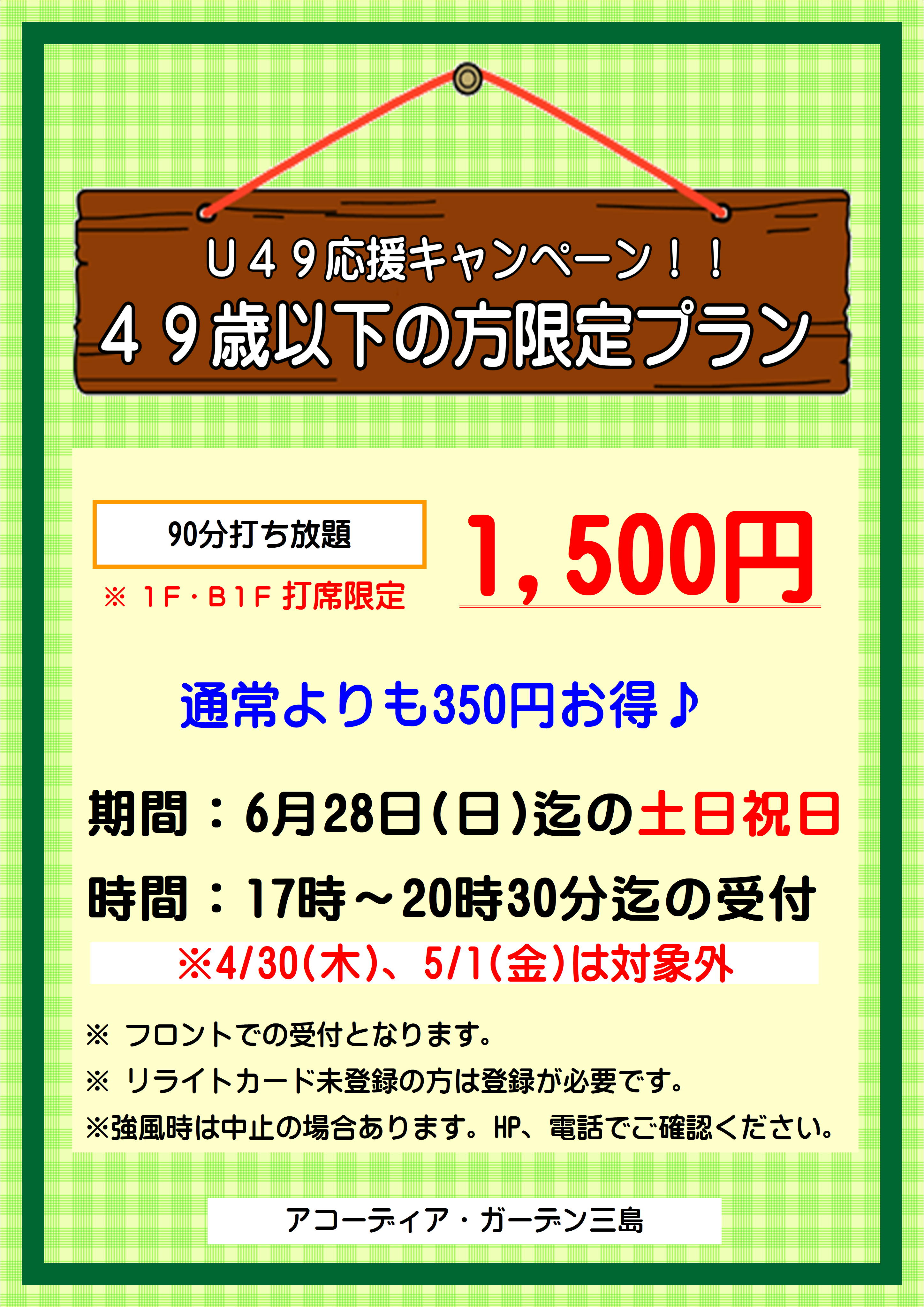 プラン : 1F、B1F打席限定 90分打ち放題1,500円