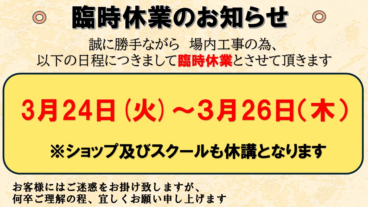 ショップ及びスクールも休講となります。