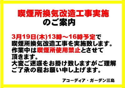 標記の件、喫煙所喚起改造工事のため作業中は喫煙所は使用禁止