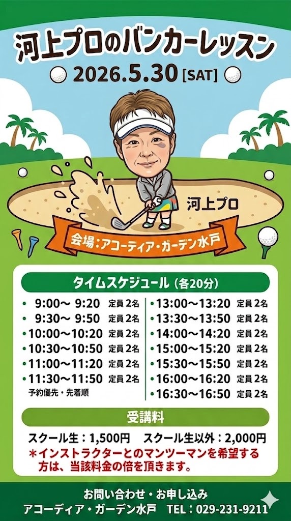 河上悦子プロのバンカーレッスンを開催します。予約制。