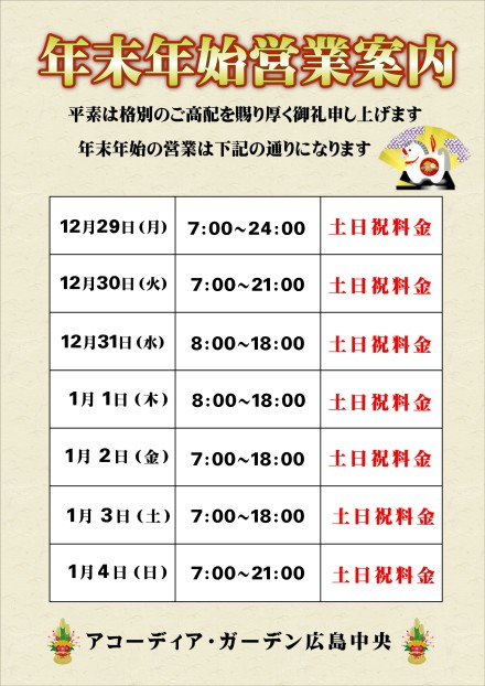 年末年始の営業は、時間・料金の変更がございます。