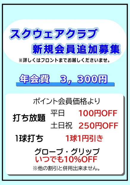 ご入会いただきますと、打ち放題が平日100円オフ、土日祝は250円オフ、