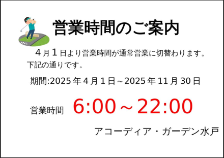 営業時間変更のお知らせいつもアコーディア・ガーデン水戸にご来場頂きまして