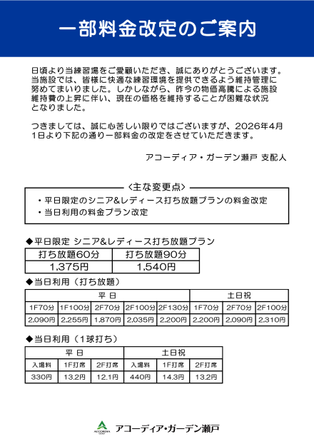 一部打席利用料金改定のご案内