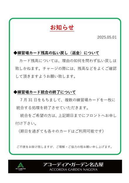 2025年7月31日をもちまして、複数の練習場カードを一枚に統合する処理を終了させていただきます。