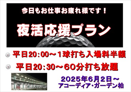 平日20:30から60分打ち放題、20:00から入場料半額6月2日から平日20時以降が
