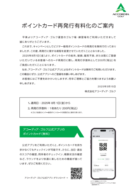 2025年8月1日(金)より、ポイントカードの紛失、破損、磁気不良、または既にご登録いただいているお客様へのカード再発行に際し、再発行手数料として200円(税込)をご負担いただくことになります。