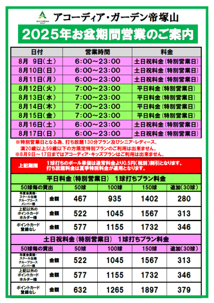 8月15日(金) 7:00~23:00(平日料金・特別営業日)