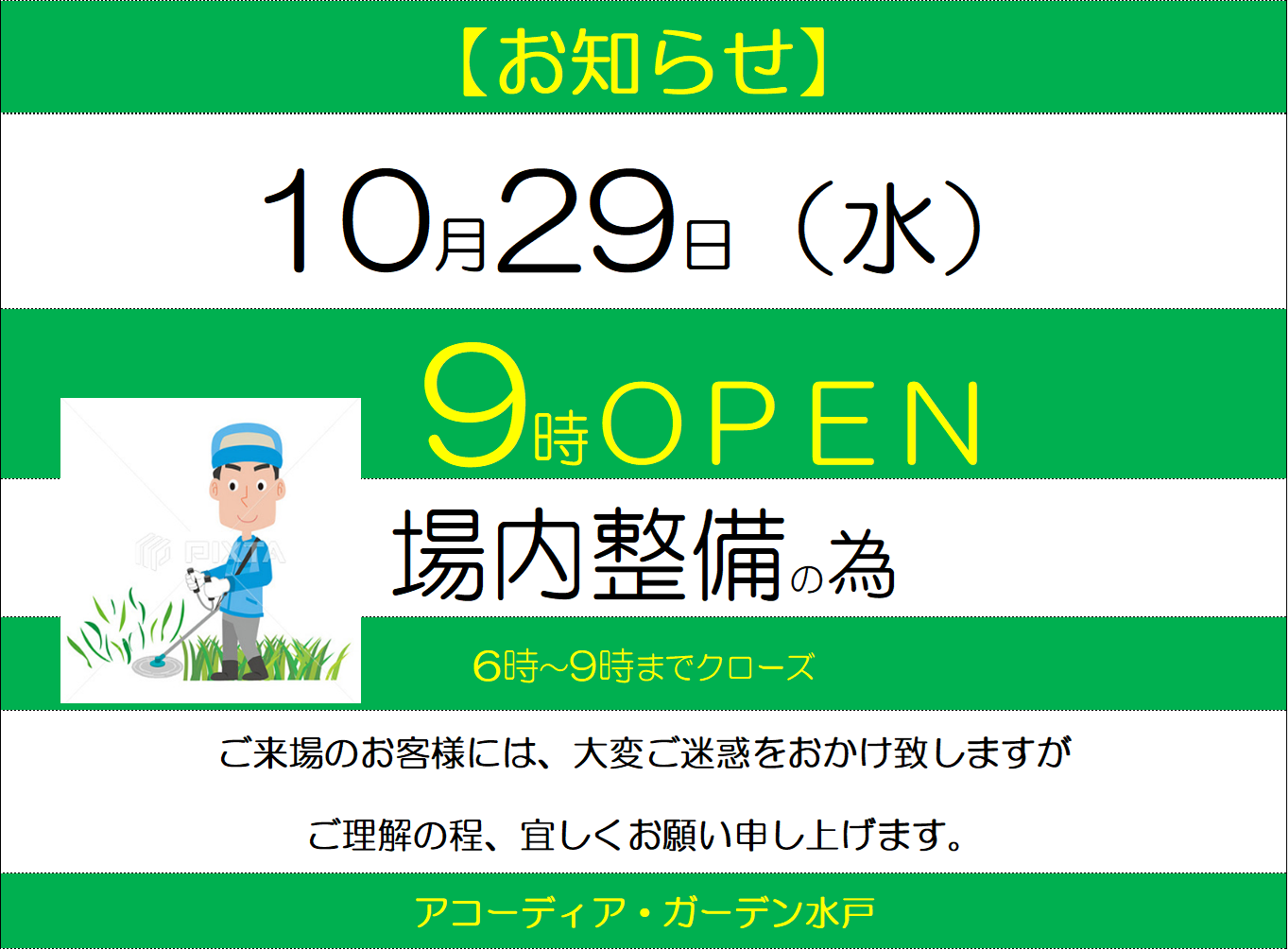 10/29(水)場内整備 9時OPEN10月29日(水)早朝~9:00 まで場内整備となっております。