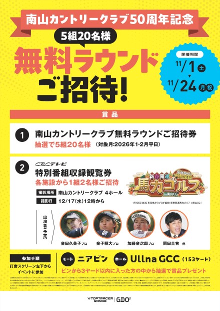 TTRモニター左下のイベントへログインし、ピンに近寄った方(3ヤード以内)から抽選で20名様が南山CCへ無料ご招待となります。