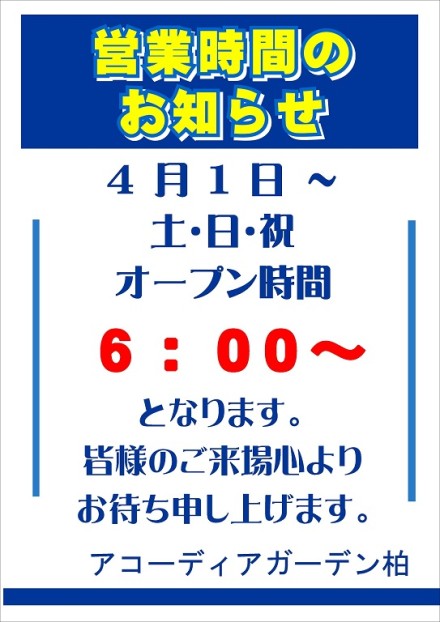 営業時間変更のお知らせいつもアコーディア・ガーデン柏をご利用頂きまして誠にありがとうございます。