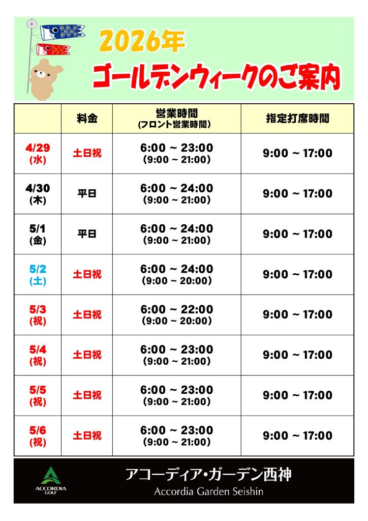 2026年ゴールデンウィークの営業案内をお知らせします。
