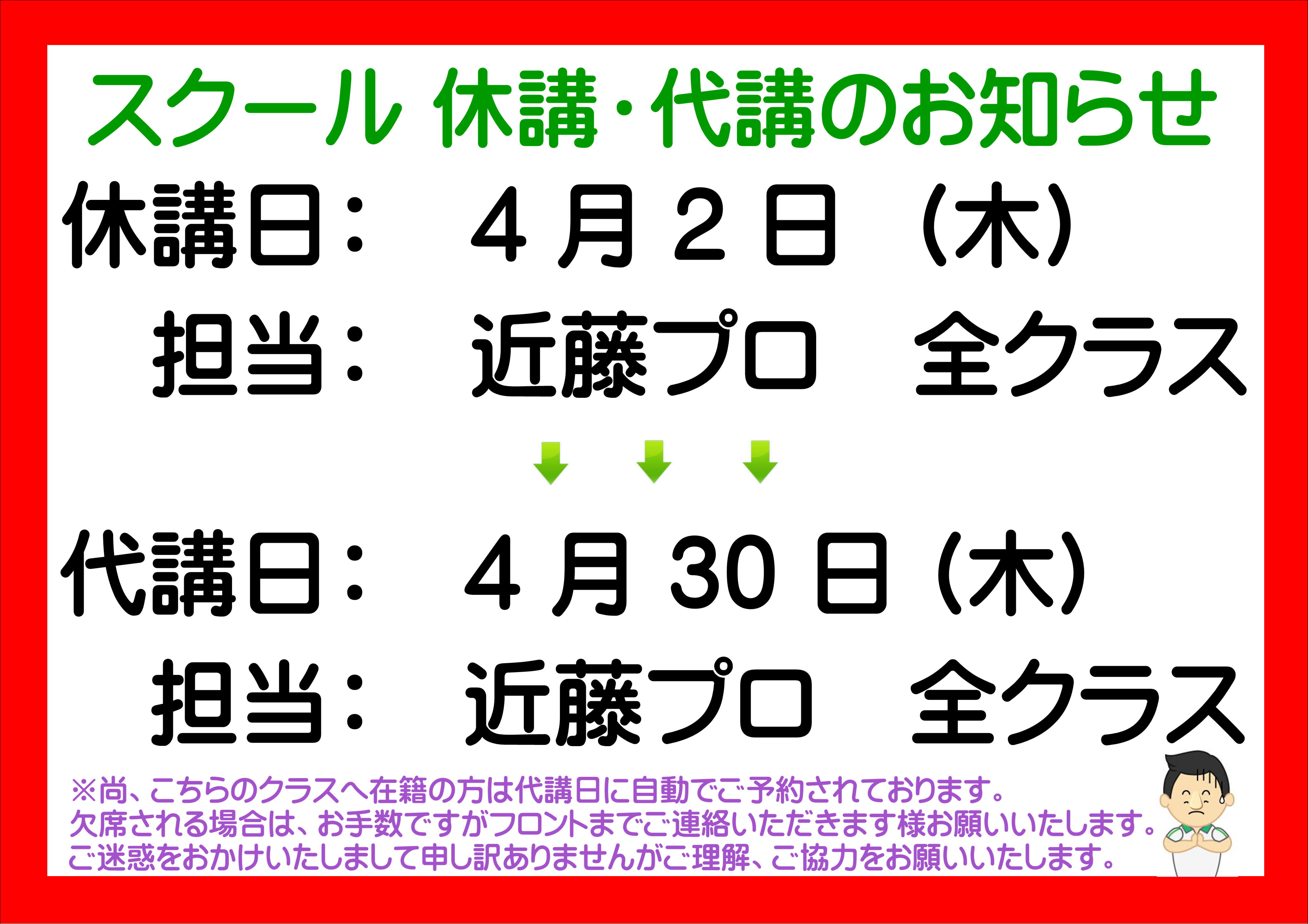 近藤プロ4月 休講・代講のお知らせ