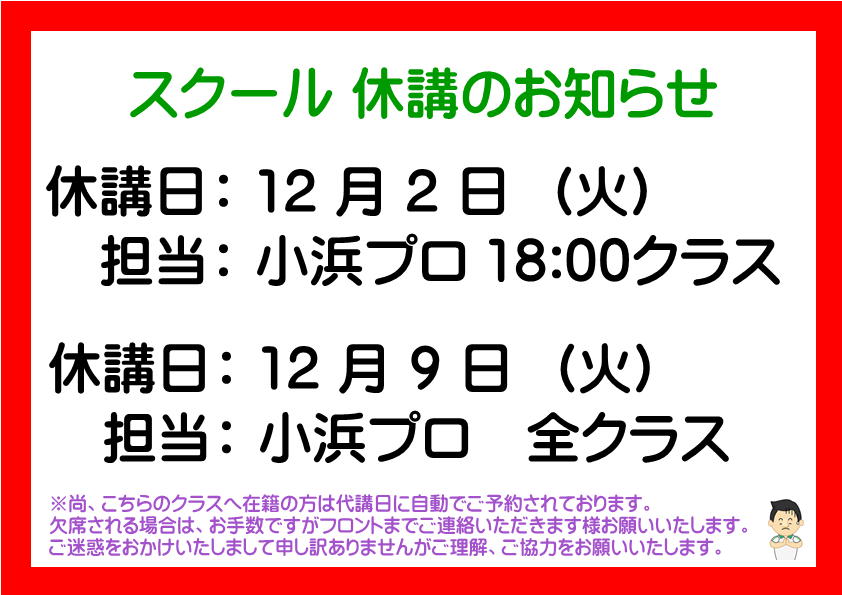 小浜プロ12月 休講のお知らせ