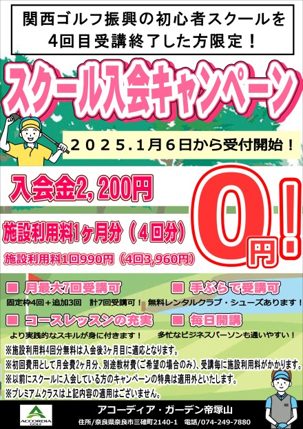 アコーディア・ガーデン帝塚山よりスクール新規入会キャンペーンのお知らせを致します。