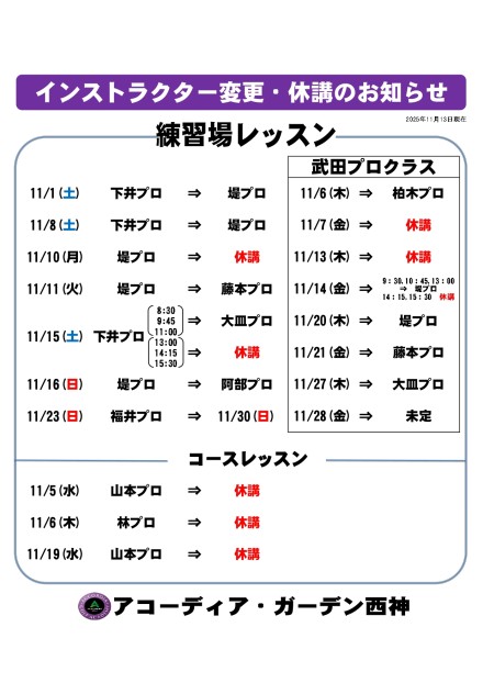 ■11月 レッスン代行のお知らせ