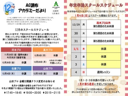 スクール生の皆様へ12月アカデミーだよりのお知らせです。詳細は画像をご確認ください。