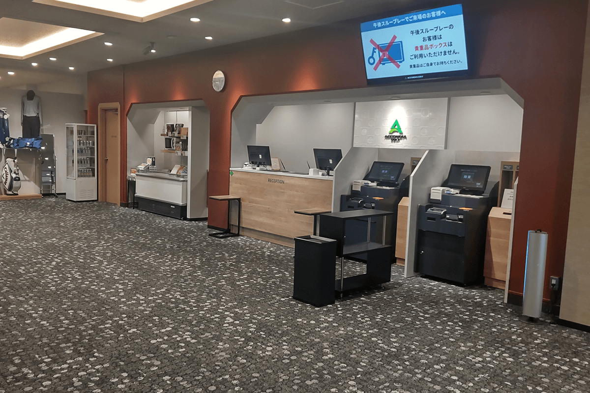 新しいコンセプトは「目に心に癒しのグリーン。」クラブハウスに入ると目の前に広がる椰子の木が南国沖縄を感じさせ、照明がカーペット模様を生かし波を連想させ、目に心に癒しを与えてコースへといざないます。
